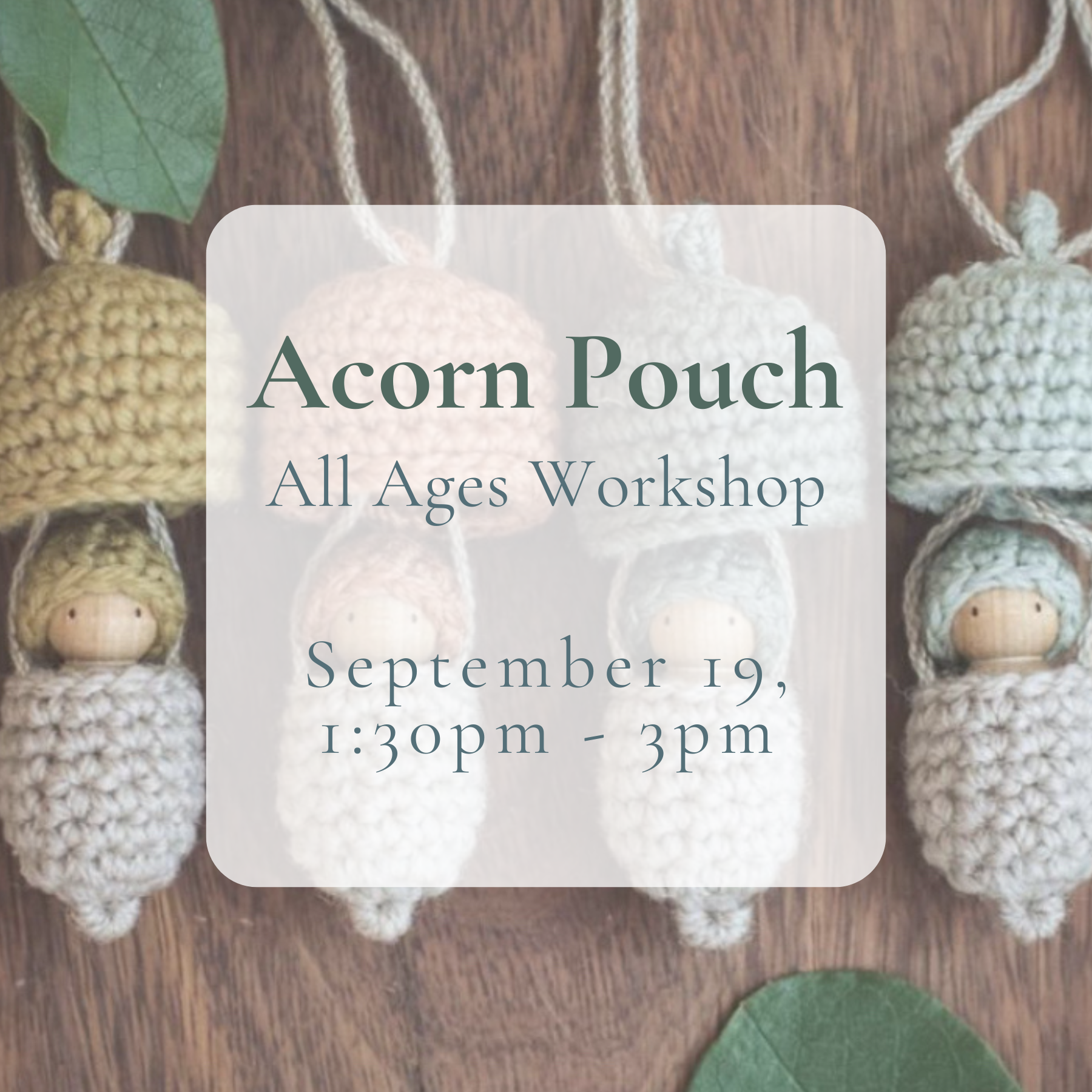 Crochet a whimsical acorn pouch and tuck a tiny wooden doll inside—just the right size for autumn treasures! In this all-ages make & take, you’ll learn to crochet in the round, slip stitch, and assemble your pouch step by step.