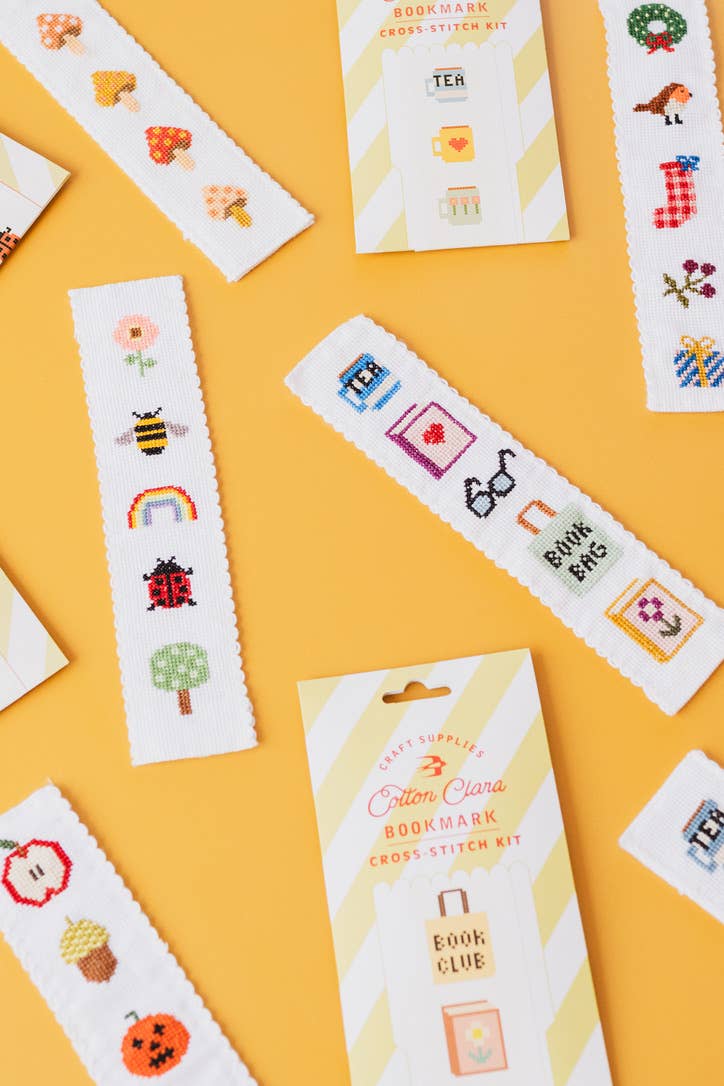 Autumn Bookmark Cross Stitch Kit – Cosy Craft for Readers Made in the UK - Celebrate the cosy season with this autumn-themed bookmark cross stitch kit, featuring a pumpkin, acorn, toadstool, and cosy socks. Designed for book lovers, beginners, and mindful makers, this counted cross stitch kit includes everything needed to create a seasonal keepsake: white aida fabric (not printed), embroidery thread, blunt needle, felt for backing, and easy-to-follow instructions. Perfect for autumn gifting, back-to-school crafting, teacher gifts, or teen creatives. Finished bookmark measures approx. 24 x 5cm and is completed with felt backing for a clean, polished look. Ideal for bookshops, libraries, gift boutiques, and lifestyle retailers.Plastic-free, recyclable, and made in the UK. A unique literary-meets-craft gift that pairs perfectly with a good book and a cosy evening in.