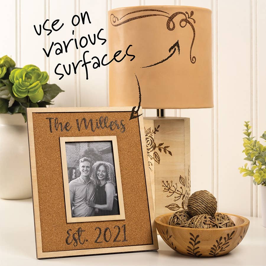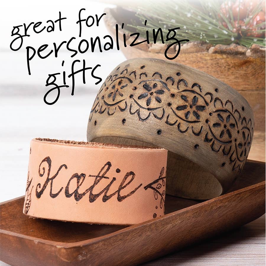 Personalize surfaces, décor, and fashion items with the Plaid 8-piece Decorative Wood Burning Tool Set. This versatile wood burning set is ideal for adding burned details, soldering, and even transferring images to all your wooden arts and crafts! Cut custom stencils or burn designs in wood with specially designed tips and a temperature control feature that allows versatility for your unique project needs. This handy tool comes with an on/off switch, tool stand, and plastic case to hold all six tips. This wood burning tool is the perfect addition to your art supplies for creating handmade gifts, home decor, and more. Add a little extra flair to your pieces with this innovative and artistic Plaid 8-piece Decorative Wood Burning Tool Set.